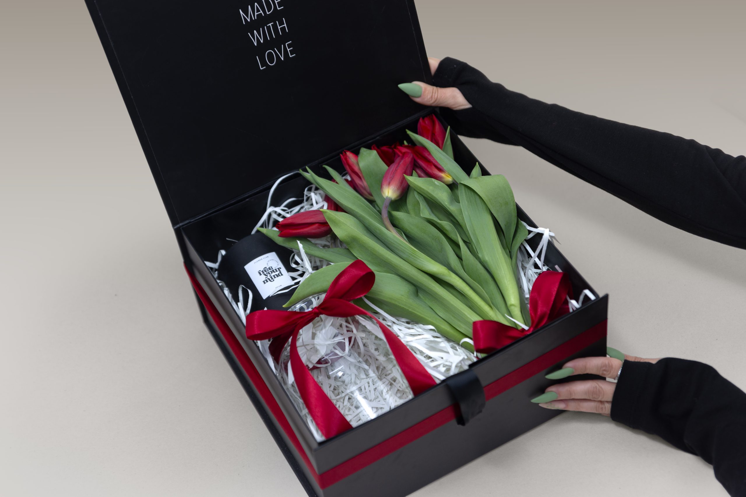 קופסה של טוליפים עם ואזה ונר ריחני מושלם